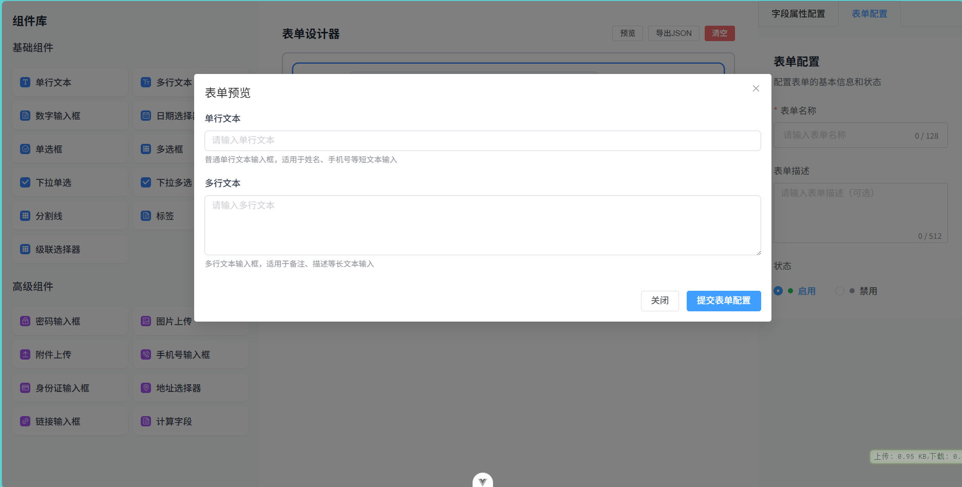 field_component表的component_type(base/advanced)分类展示组件,仅显示状态为启用(status=1)的组件,支持拖拽添加到设计区;中间设计 / 预览区:设计模式下支持字段排序、删除、配置操作;预览模式下按元数据渲染可提交的表单,实时校验字段规则;