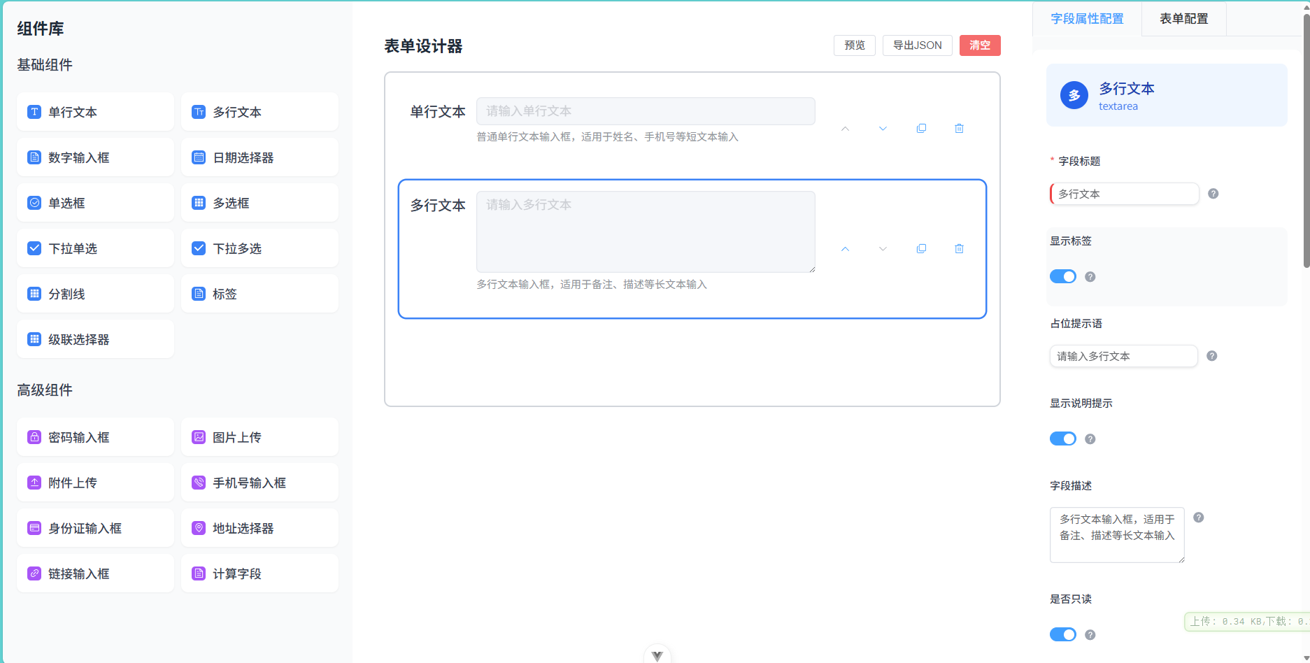 配置层是用户与动态表单交互的入口,核心功能是让非技术人员通过拖拽、勾选等操作完成字段定义。