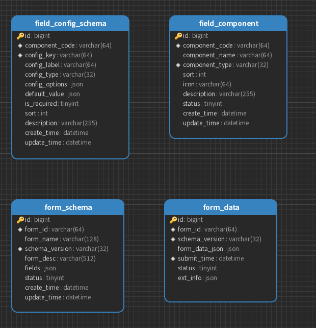 `fields` json NOT NULL COMMENT '表单字段配置集合(核心Schema)',