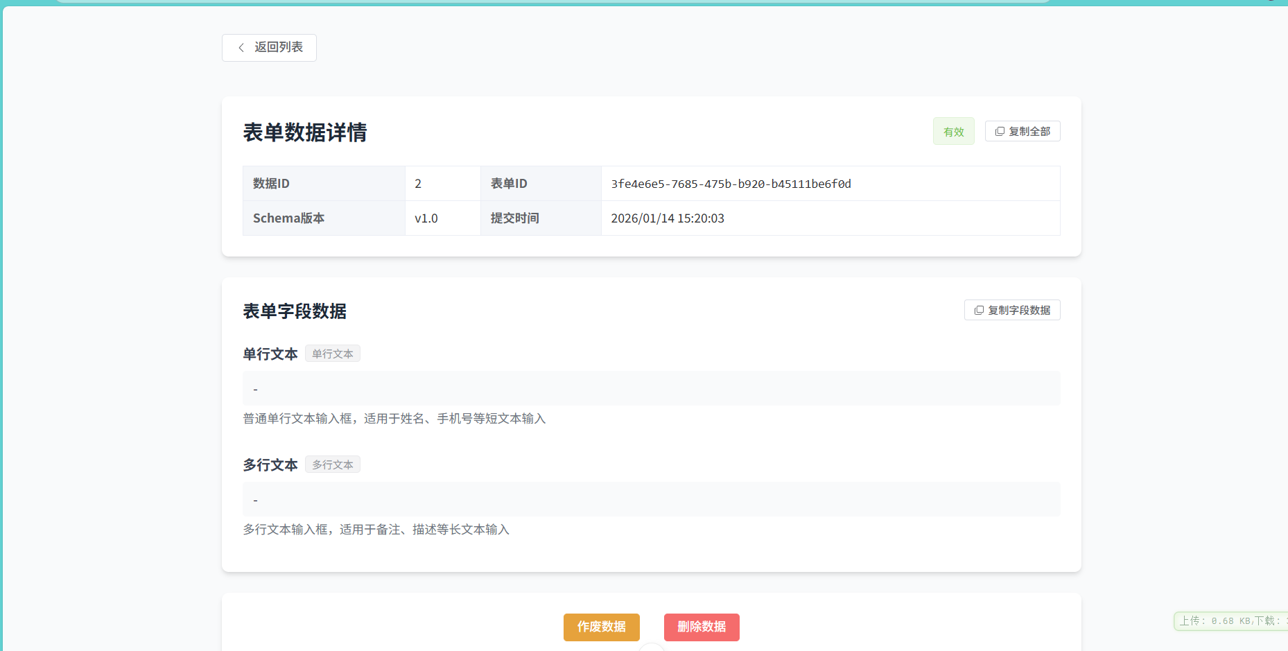 schema_version(如 v1/v2),提交到后端form_schema表,保证同表单 ID 下不同版本的配置隔离;表单数据提交:预览模式下提交表单时,校验字段规则(基于元数据中的