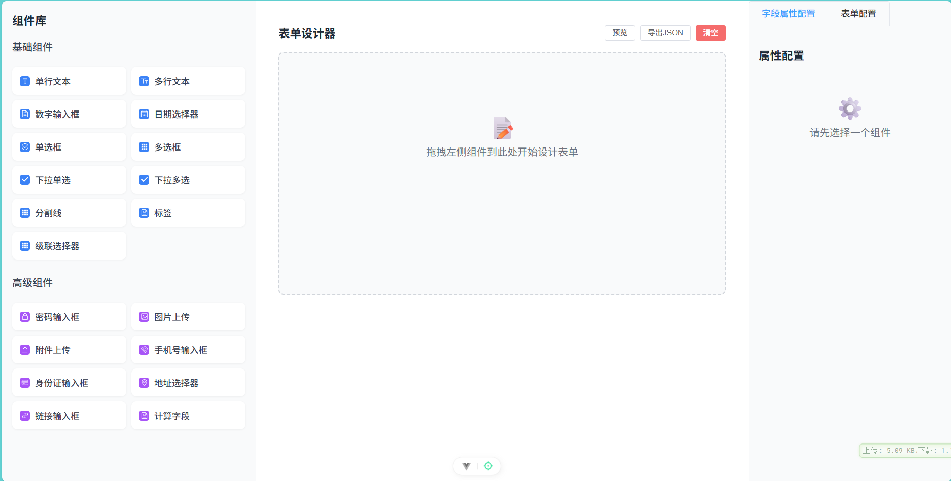 field_component表拉取启用状态的组件列表(区分基础 / 高级字段),渲染左侧可拖拽的组件库;配置面板渲染:选中组件后,从